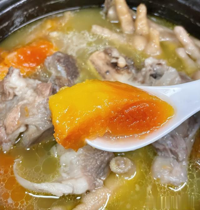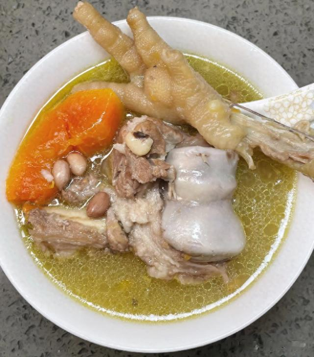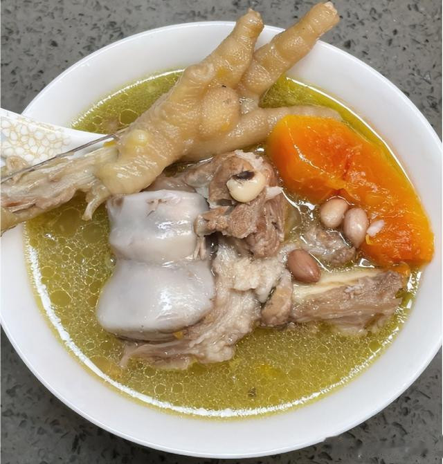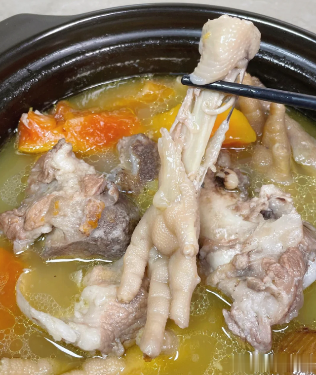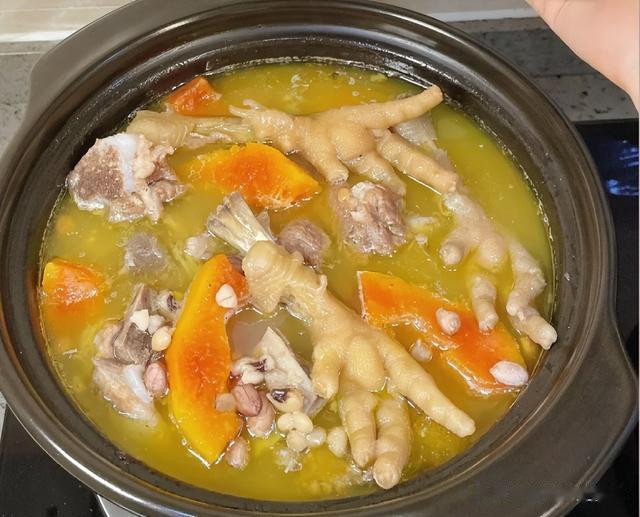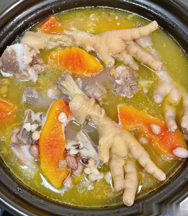 木瓜芡实眉豆鸡爪猪骨汤是许多广东人的最爱,喝起来那叫一个鲜美!木瓜的清甜、芡实的粉糯、眉豆的绵软,还有鸡爪和猪骨的醇厚,各种味道交织在一起,简直是一种味蕾的盛宴。而且,经过长时间的炖煮,所有的营养都融入了汤中,每一口都是满满的滋补,补充能量的同时,还可以赶跑体内湿气,对身体大有裨益。