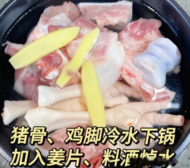 第二步:排骨提前处理成块,可以用冷水浸泡几个小时,逼出血水,芡实和眉豆提前用清水泡发2小时,这样更容易煮烂;鸡爪剪去指甲,和猪骨一起冷水下锅,加入几片姜,大火煮开后撇去浮沫,捞出用清水冲洗干净,这样会让汤品更浓稠。