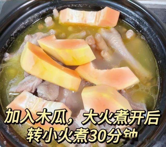 第五步:最后,把切好的木瓜块放入锅中,继续炖煮15-20分钟,直到木瓜软烂,汤色金黄。